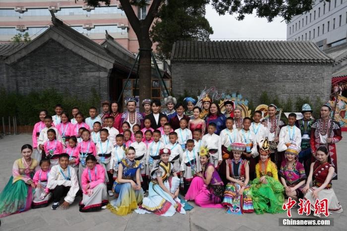 6月1日,來自青海省玉樹藏族自治州兒童福利院的40名藏族青少年參觀中華民族共同體體驗(yàn)館。圖為孩子們與參加演出的多民族藝術(shù)家們合影。中新社記者 崔楠 攝