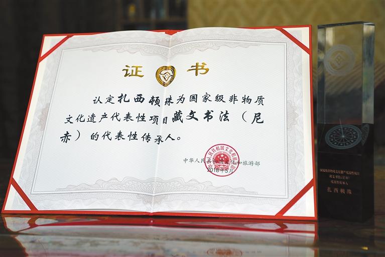2018年,扎西頓珠被評(píng)為國家級(jí)非物質(zhì)文化遺產(chǎn)代表性項(xiàng)目藏文書法(尼赤)的代表性傳承人。
