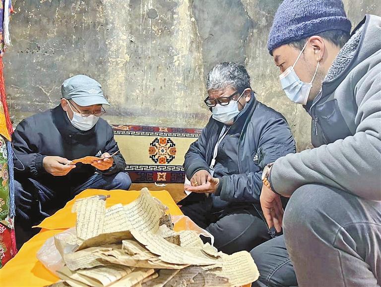 扎西頓珠陪同自治區(qū)圖書館古籍保護(hù)中心專家在林周縣普查藏文古籍。