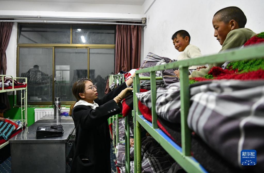 扎西宗鄉(xiāng)完全小學(xué)的值班老師在檢查孩子睡覺時(shí)是否蓋好被子(6月5日攝)。新華社記者 晉美多吉 攝