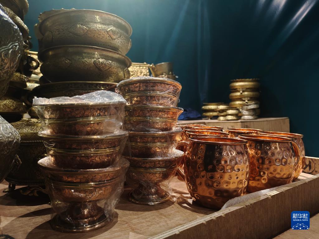 這是藏博會(huì)上的尼泊爾銅器展示點(diǎn)位。新華社記者 劉洲鵬 攝