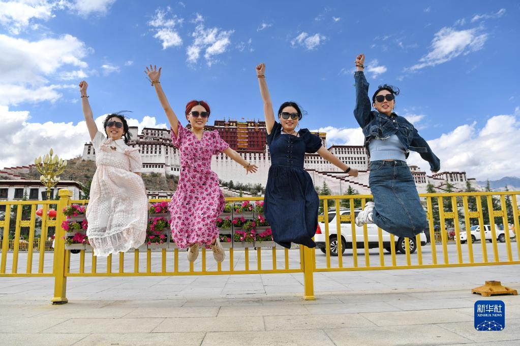 游客在布達(dá)拉宮廣場(chǎng)上合影留念(6月15日攝)。新華社記者 張汝鋒 攝