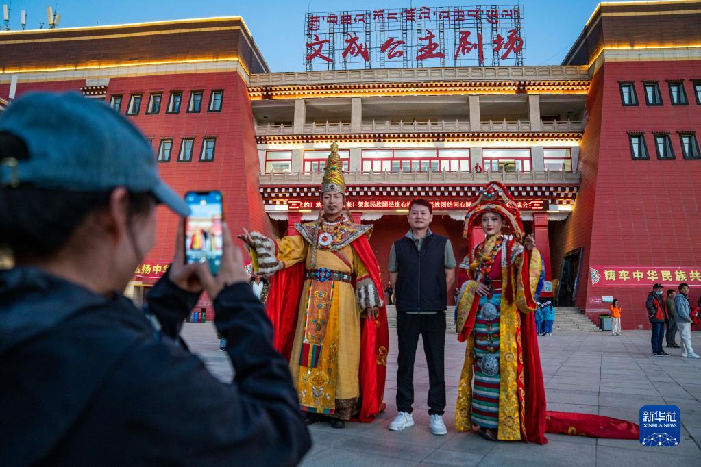 游客在文成公主劇場(chǎng)前和演員合影留念(6月6日攝)。新華社記者 孫非 攝