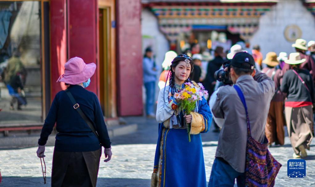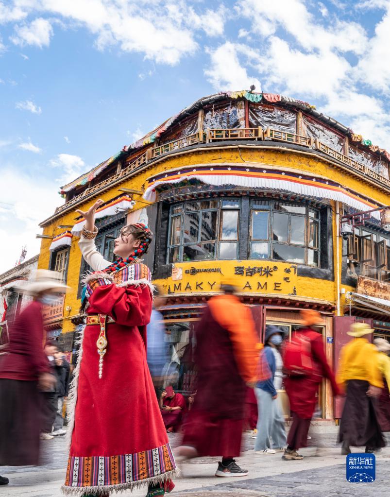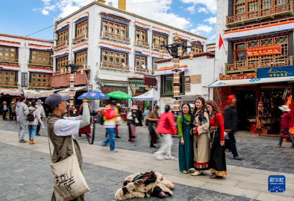 游客身著藏裝在八廓街拍照留念(6月6日攝)。新華社記者 姜帆 攝
