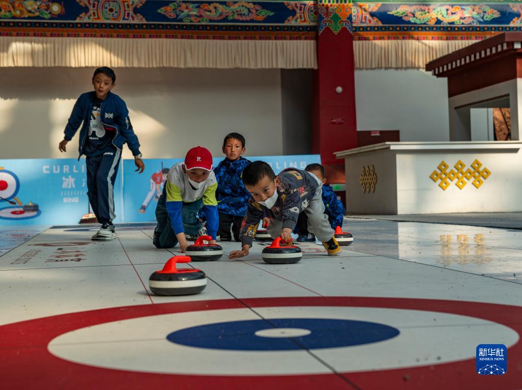 6月17日,幾名孩子在第五屆藏博會(huì)現(xiàn)場體驗(yàn)冰壺。新華社記者 孫非 攝