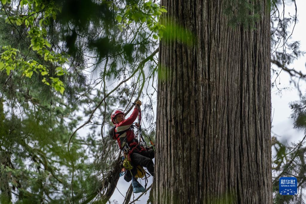 6月15日,攀樹(shù)專家劉團(tuán)璽在攀爬亞洲第一高樹(shù)前做準(zhǔn)備工作。新華社記者 晉美多吉 攝