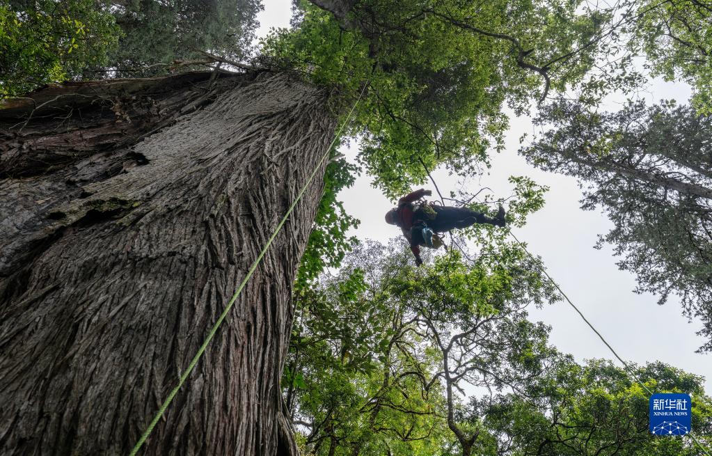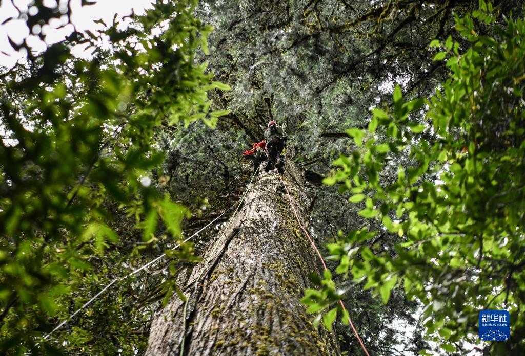 6月15日,國(guó)家重要野生植物種質(zhì)資源庫(kù)辰山中心負(fù)責(zé)人鐘鑫(下)和助手在攀爬亞洲第一高樹(shù)附近的高樹(shù),采集數(shù)據(jù)。新華社記者 晉美多吉 攝