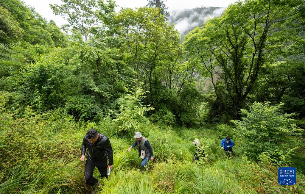 6月15日,波密縣林草局工作人員西繞(左)帶領(lǐng)大家穿過(guò)原始森林尋找亞洲第一高樹(shù)。新華社記者 費(fèi)茂華 攝