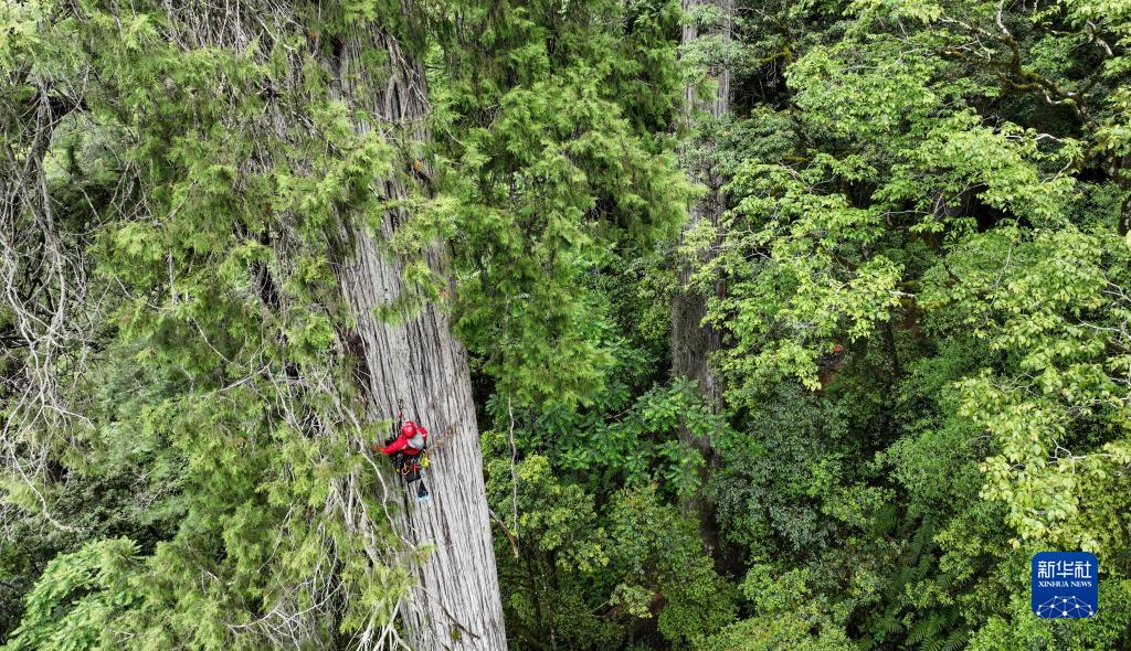 6月15日,攀樹(shù)專家劉團(tuán)璽在攀爬亞洲第一高樹(shù)(無(wú)人機(jī)照片)。新華社記者 晉美多吉 攝