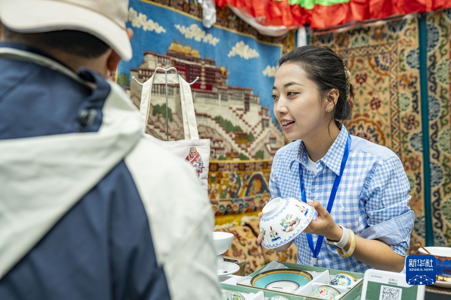 在第五屆“藏博會(huì)”現(xiàn)場(chǎng),工作人員向顧客介紹產(chǎn)品(6月18日攝)。新華社記者 孫非 攝