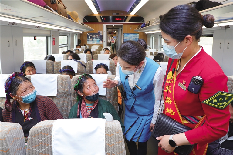 2022年初,青藏集團(tuán)有限公司在管內(nèi)各站、車(chē)開(kāi)展“天路格?;ā逼放苿?chuàng)建以來(lái),拉林鐵路各車(chē)站、各次列車(chē)上都能看到“天路格?;ā狈?wù)隊(duì)員,他們用真誠(chéng)、熱情、熱心為每一位旅客提供溫馨細(xì)致的服務(wù)?!?月初,我?guī)е⒆觼?lái)西藏旅游,6月20日前往林芝,游玩了三天,由于家里有事,不得不趕回去,就買(mǎi)了今天中午回拉薩的火車(chē)票,剛開(kāi)車(chē)不久我姑娘就發(fā)燒,肚子痛。列車(chē)員看見(jiàn)孩子難受就詢(xún)問(wèn)情況,并找來(lái)列車(chē)長(zhǎng)周晶,通過(guò)廣播為我們找醫(yī)生,還好沒(méi)啥大事,就是腸胃感冒,我也就放心了。周晶車(chē)長(zhǎng)也一直在旁邊幫我照顧孩子,拿濕毛巾擦臉,蓋毛毯,送來(lái)熱水,太細(xì)心了,讓我很感動(dòng)。她們工作認(rèn)真負(fù)責(zé),服務(wù)周到,我一路上都親身感受到了高原動(dòng)車(chē)的熱情?!痹?4日林芝到拉薩的C926次列車(chē)上,來(lái)自四川的高雅女士拉著記者激動(dòng)地說(shuō)。