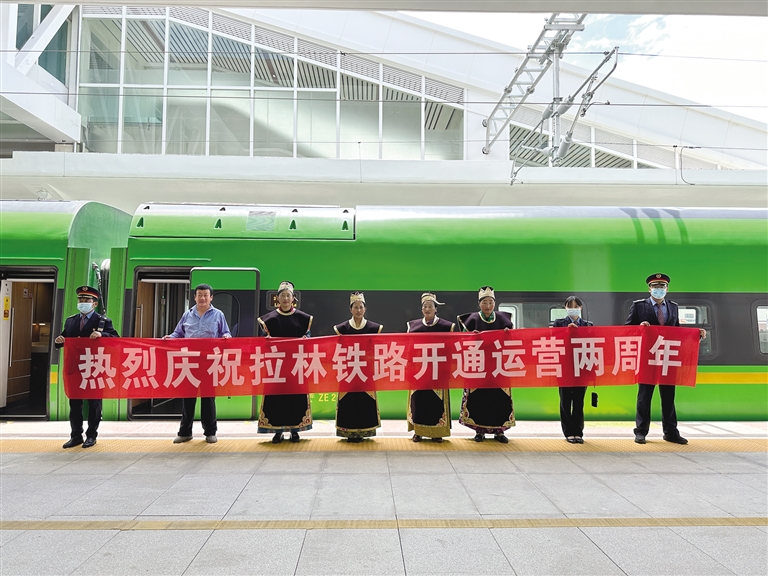 2021年6月25日,拉林鐵路開(kāi)通運(yùn)營(yíng),結(jié)束了藏東南不通鐵路的歷史,復(fù)興號(hào)動(dòng)車(chē)開(kāi)到西藏,駛上拉林鐵路,拉薩至山南、林芝最快1小時(shí)4分、3小時(shí)30分可達(dá);山南至林芝最快2小時(shí)22分可達(dá),相比汽車(chē),從拉薩到林芝的時(shí)間幾乎節(jié)省了一半,從山南到林芝,也節(jié)省了2個(gè)多小時(shí)。兩年來(lái),隨著運(yùn)行方式逐漸成熟,鐵路方便、快捷的運(yùn)輸優(yōu)勢(shì)逐步顯現(xiàn),客流持續(xù)攀升,青藏集團(tuán)有限公司及時(shí)根據(jù)客流情況在周末、節(jié)假日、寒暑假等客流高峰期增開(kāi)281趟臨時(shí)旅客列車(chē)。兩年來(lái),拉林鐵路共運(yùn)送旅客182.5萬(wàn)人次,運(yùn)輸貨物41.91萬(wàn)噸,拉近了藏東南地區(qū)9個(gè)城市的距離,也深刻改變了當(dāng)?shù)厝嗣竦墓ぷ骱蜕钣^念。
