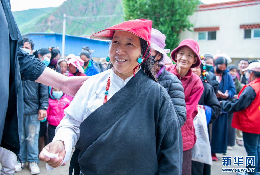 7月12日,群眾在西藏丁青縣西藏丁青縣尺犢鎮(zhèn)看完病后拿到組委會(huì)捐贈(zèng)的藥品。新華網(wǎng) 旦增努布 攝