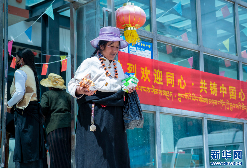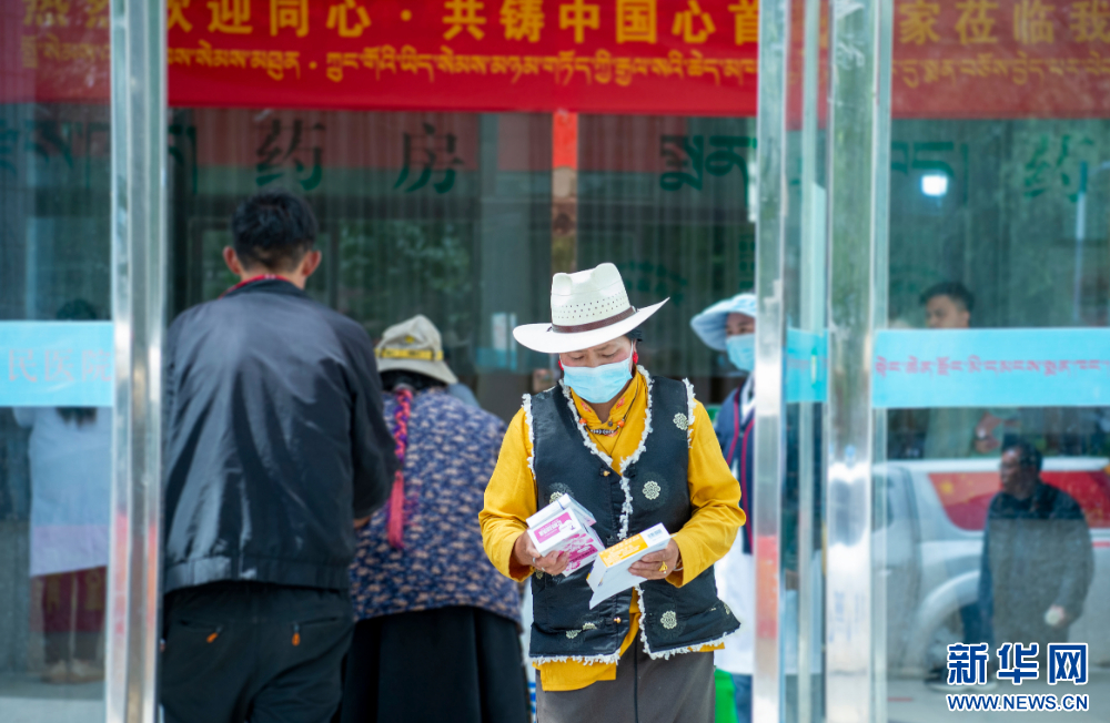 7月9日,群眾在西藏丁青縣人民醫(yī)院內(nèi)看完病后拿到組委會(huì)捐贈(zèng)的藥品。新華網(wǎng) 旦增努布 攝