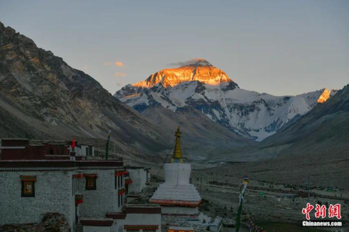 位于西藏日喀則市定日縣的世界第一高峰珠穆朗瑪峰顯露出“日照金山”的美景。貢嘎來(lái)松 攝
