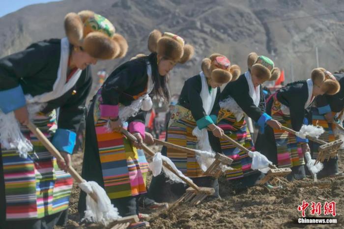 2021年3月16日,藏歷鐵牛年二月初三,西藏自治區(qū)拉薩市堆龍德慶區(qū)德慶村的上百位村民身著盛裝舉行傳統(tǒng)春耕儀式。貢嘎來(lái)松 攝
