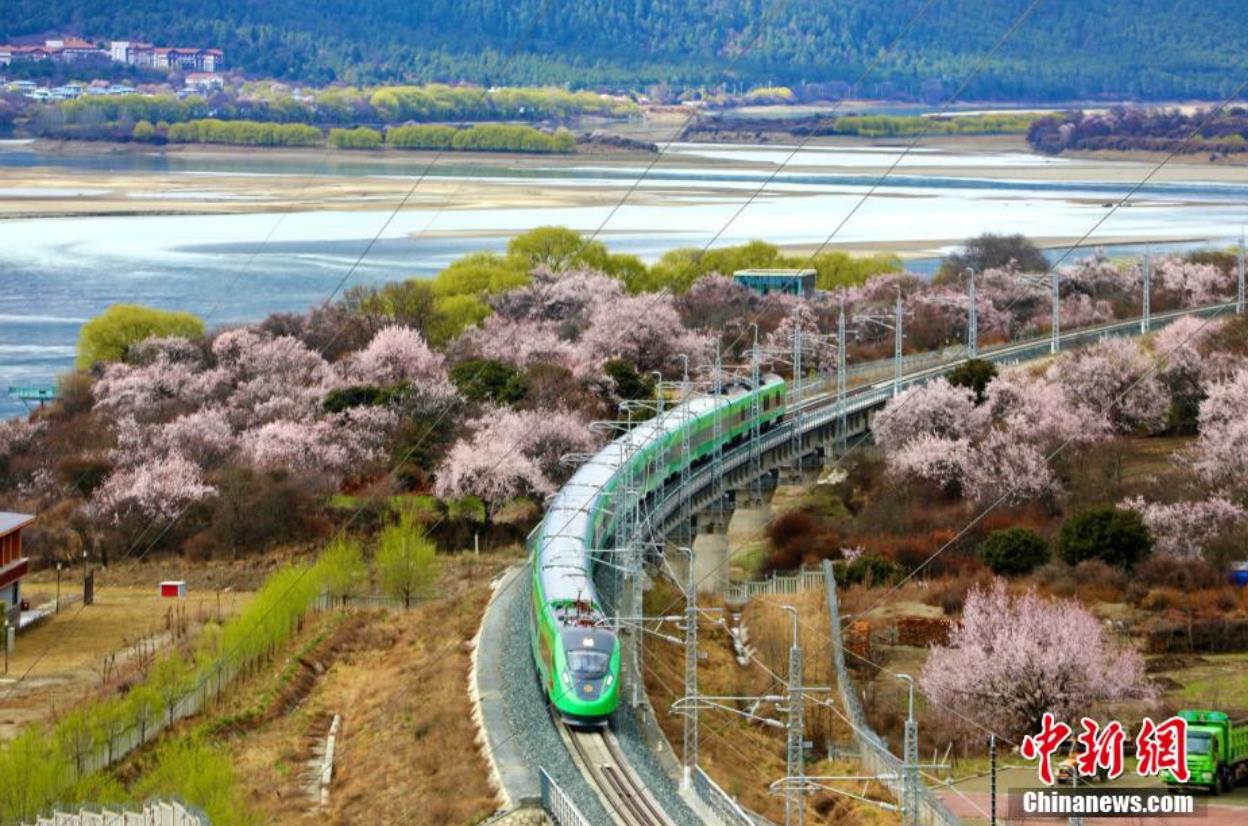資料圖:桃花、嫩柳與國(guó)槐綠涂裝的高原復(fù)興號(hào)。 馬生明 攝