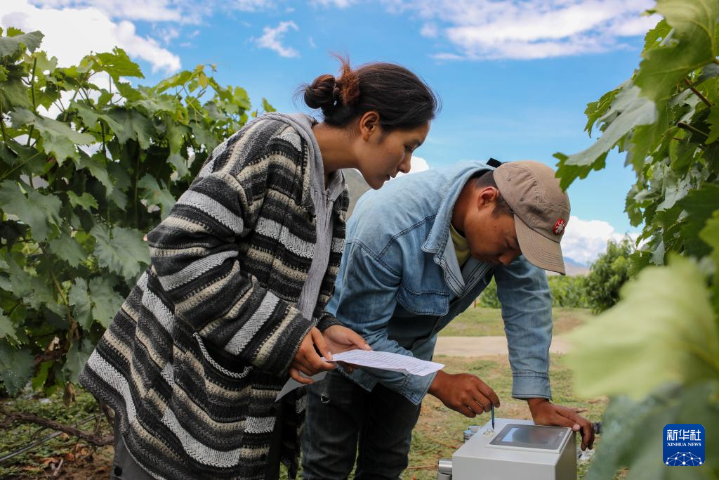 7月26日,桑日縣一家葡萄酒企業(yè)的員工曲珍(左)在葡萄園里向技術(shù)員何志榮學習操作光譜儀。新華社記者 姜帆 攝