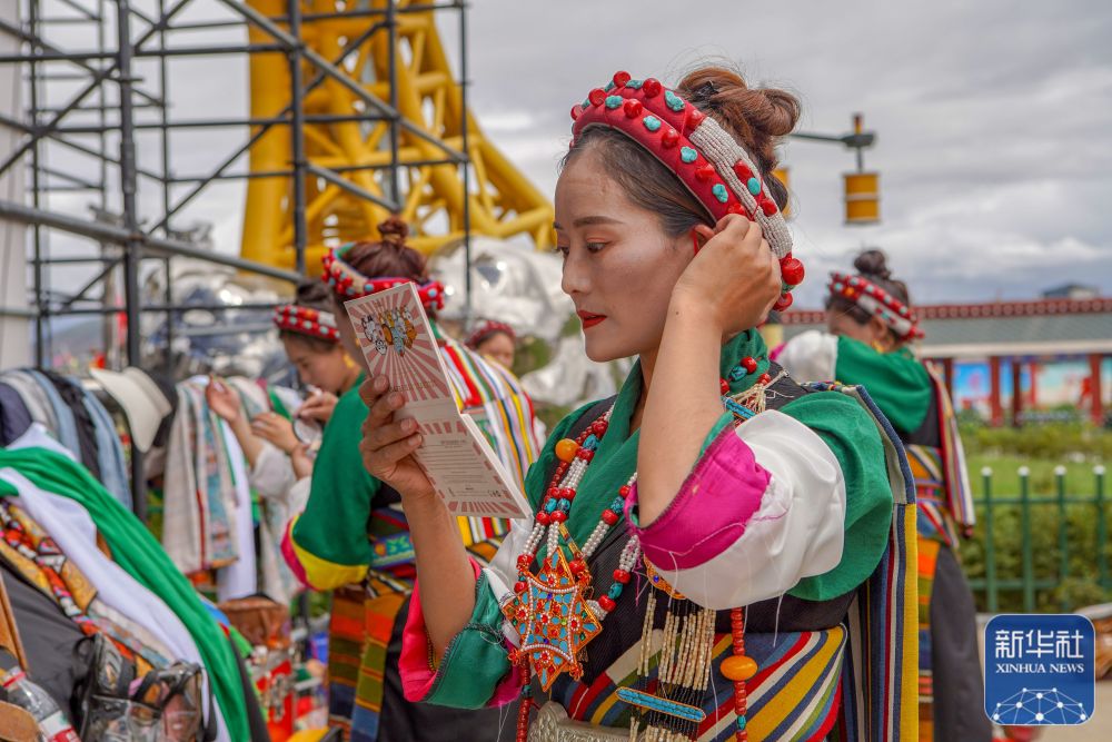 堆諧表演前,格桑卓瑪在后臺(tái)整理妝容(8月4日攝)。