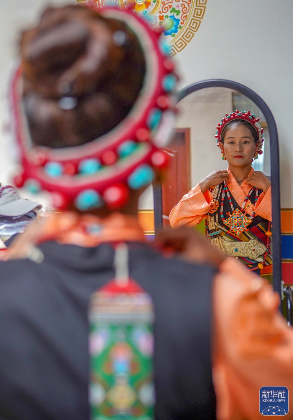 堆諧排練前,格桑卓瑪在鏡子前整理妝容(8月4日攝)。