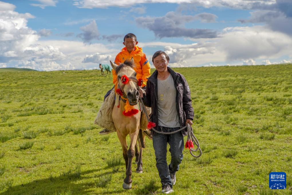 列熱覺旦騎著馬,他的父親次扎達(dá)牽著馬行走在草原上(8月9日攝)。新華社記者 邵澤東 攝