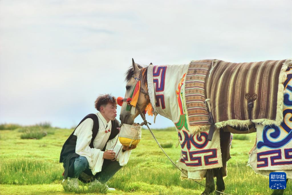 次扎達(dá)在給馬兒“隆達(dá)熱巴”喂食(8月9日攝)。新華社記者 陳澤鵬 攝