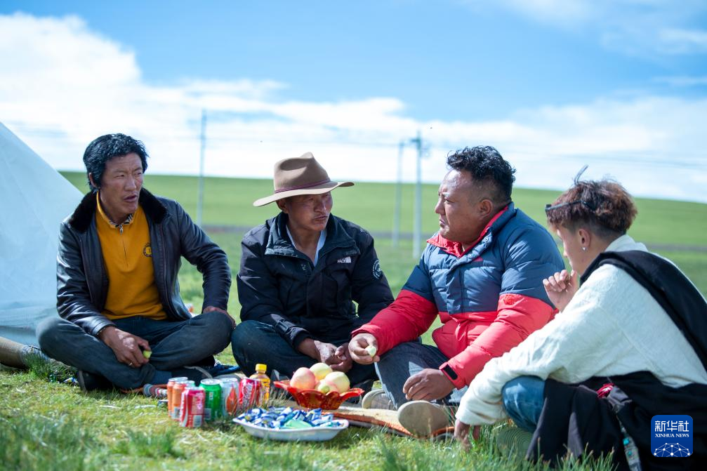 8月11日,次扎達(dá)(左二)和家人在草原上休息。新華社發(fā)(旦增努布攝)