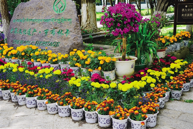 雪頓節(jié)除了看藏戲、賽馬等傳統(tǒng)表演之外,人們也喜歡到羅布林卡觀賞花卉。近期,記者走訪羅布林卡時(shí)發(fā)現(xiàn),園內(nèi)花團(tuán)錦簇、游人如織,大部分宮殿及人流量較大的道路上已擺放好了盆栽。園區(qū)道路間擺放的盆栽花卉主要有繡球花、萬(wàn)壽菊、金魚(yú)草、波斯菊、高雪輪、麥稈菊等,而宮殿前擺放的花卉主要有一品紅、繡球花、萬(wàn)壽菊等。