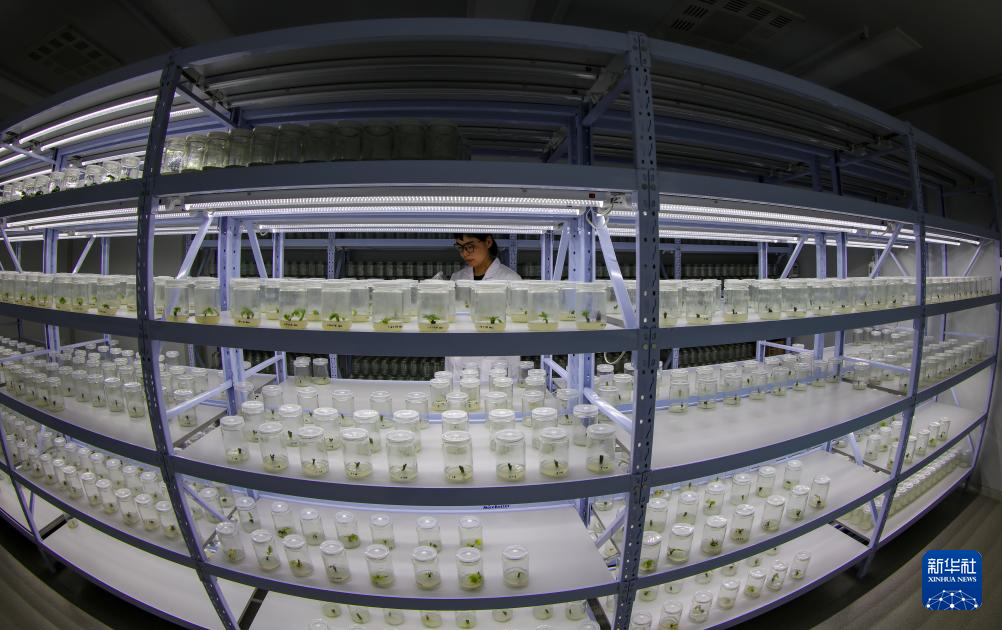 劉利平在長江大學(xué)西藏高原核桃產(chǎn)業(yè)研究所檢查核桃組織培養(yǎng)標(biāo)本(7月27日攝)。新華社記者 姜帆 攝