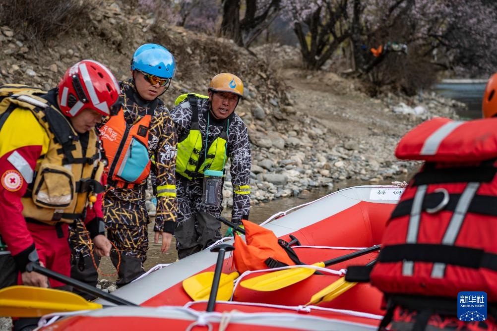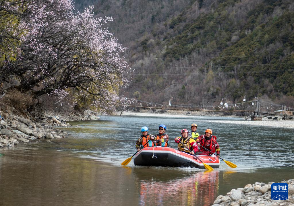 扎史品初(右二)和隊(duì)友在巴河上漂流(4月13日攝)。新華社記者 孫非 攝