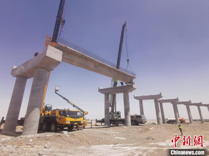 據(jù)介紹,跨青藏鐵路轉(zhuǎn)體橋梁設(shè)計(jì)長(zhǎng)度687米,分主橋和引橋兩部分,引橋共設(shè)計(jì)箱梁116片。預(yù)制箱梁架設(shè)屬于高風(fēng)險(xiǎn)施工,本次架設(shè)的首片箱梁設(shè)計(jì)長(zhǎng)度20米,重量55噸,采用兩臺(tái)大型汽車吊協(xié)同作業(yè)完成架設(shè)。