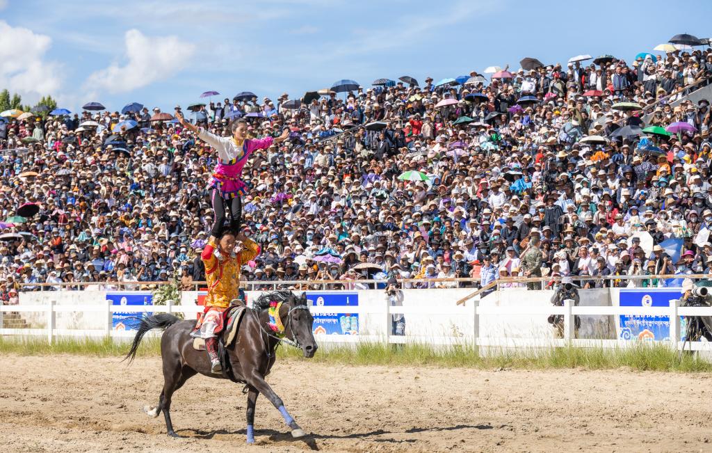 8月17日,2023拉薩雪頓節(jié)賽馬大會(huì)現(xiàn)場(chǎng),兩位騎手正在進(jìn)行單馬雙人表演。新華社記者 丁增尼達(dá) 攝
