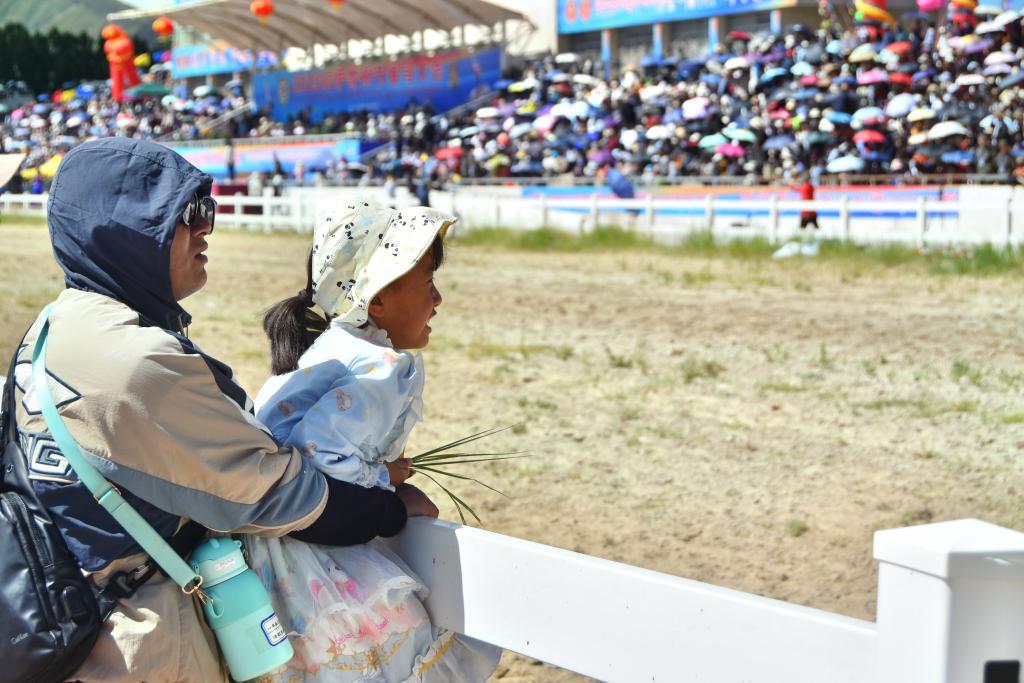 8月17日,2023拉薩雪頓節(jié)賽馬大會(huì)現(xiàn)場(chǎng),一位父親帶著女兒來(lái)看比賽。新華社記者 劉文博 攝