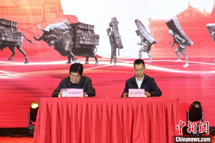 圖為四川省農(nóng)業(yè)農(nóng)村廳一級(jí)巡視員子克拉格(圖左)和西藏自治區(qū)農(nóng)業(yè)農(nóng)村廳副廳長羅丹(圖右)簽訂深化農(nóng)業(yè)合作框架協(xié)議現(xiàn)場。貢確 攝