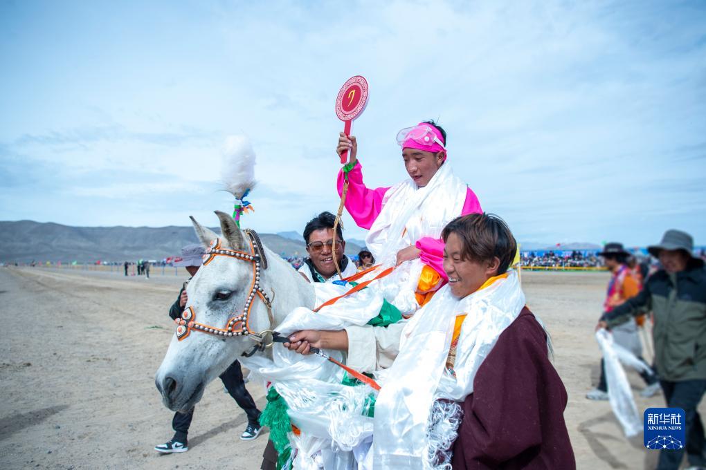 8月23日,改則縣巴桑倫珠(上)和駿馬“玉赤達歐”在奪得8.5公里速度賽冠軍后。新華社發(fā)(旦增努布攝)