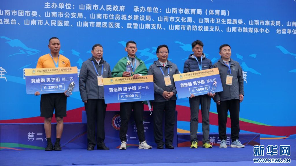 圖為2023雅礱文化旅游節(jié)環(huán)城馬拉松賽競(jìng)速跑男子組頒獎(jiǎng)典禮(8月26日攝)。新華網(wǎng) 柑丹鴦琦 攝