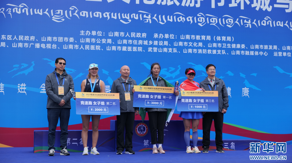 圖為2023雅礱文化旅游節(jié)環(huán)城馬拉松賽競(jìng)速跑女子組頒獎(jiǎng)典禮(8月26日攝)。新華網(wǎng) 柑丹鴦琦 攝