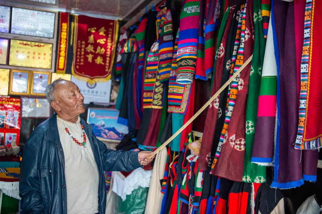 8月27日,努拉老人在向顧客介紹森郭服飾。(旦增努布 攝)