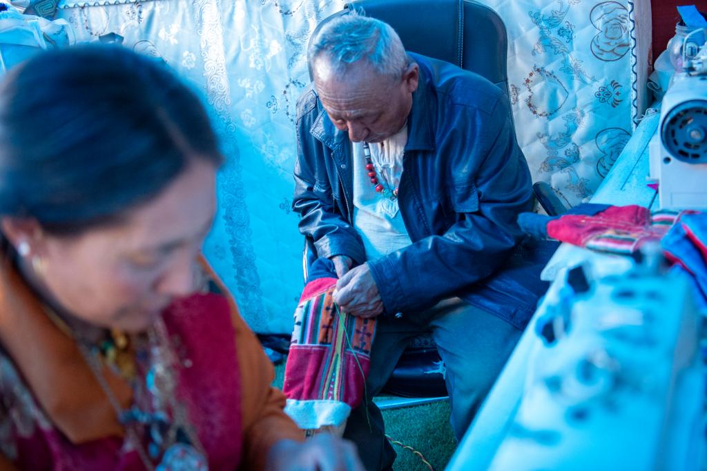 8月27日,努拉老人和妻子玉措正在縫制森郭服飾。(旦增努布 攝)