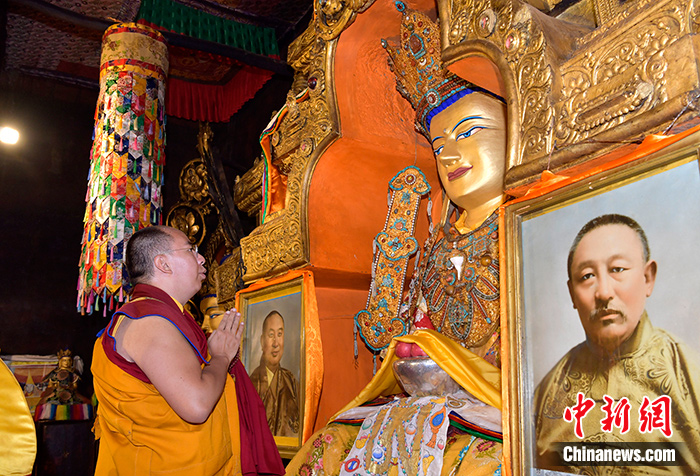 9月13日,班禪在扎什倫布寺強(qiáng)巴佛殿朝拜強(qiáng)巴佛。中新社記者 李林 攝
