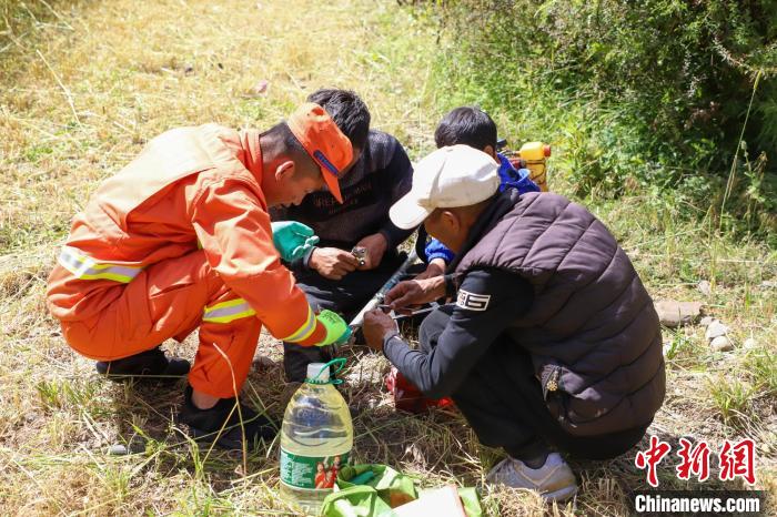 消防員將農牧民的青稞掛到架子上晾曬,這是當?shù)氐膫鹘y(tǒng)青稞晾曬方式。劉星文 攝