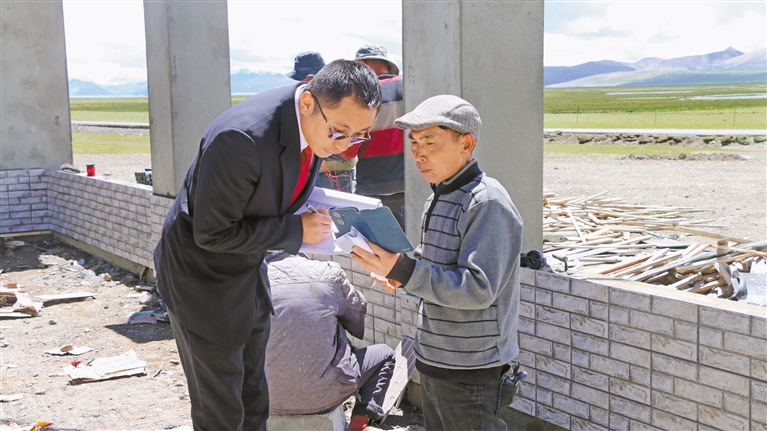 普瑪江塘中心法庭負(fù)責(zé)人巴桑次仁(左)正在向務(wù)工人員了解相關(guān)情況。
