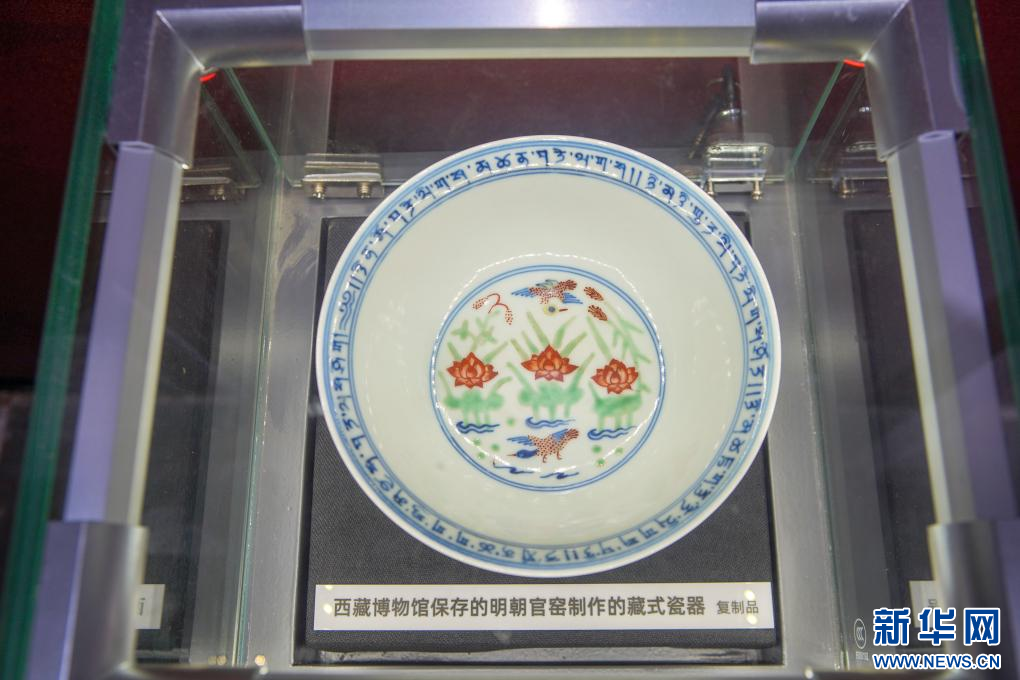 館內(nèi)陳列的西藏博物館保存的明朝官窯制作的藏式瓷器(復(fù)制品)。(9月27日攝)新華社記者 邵澤東 攝
