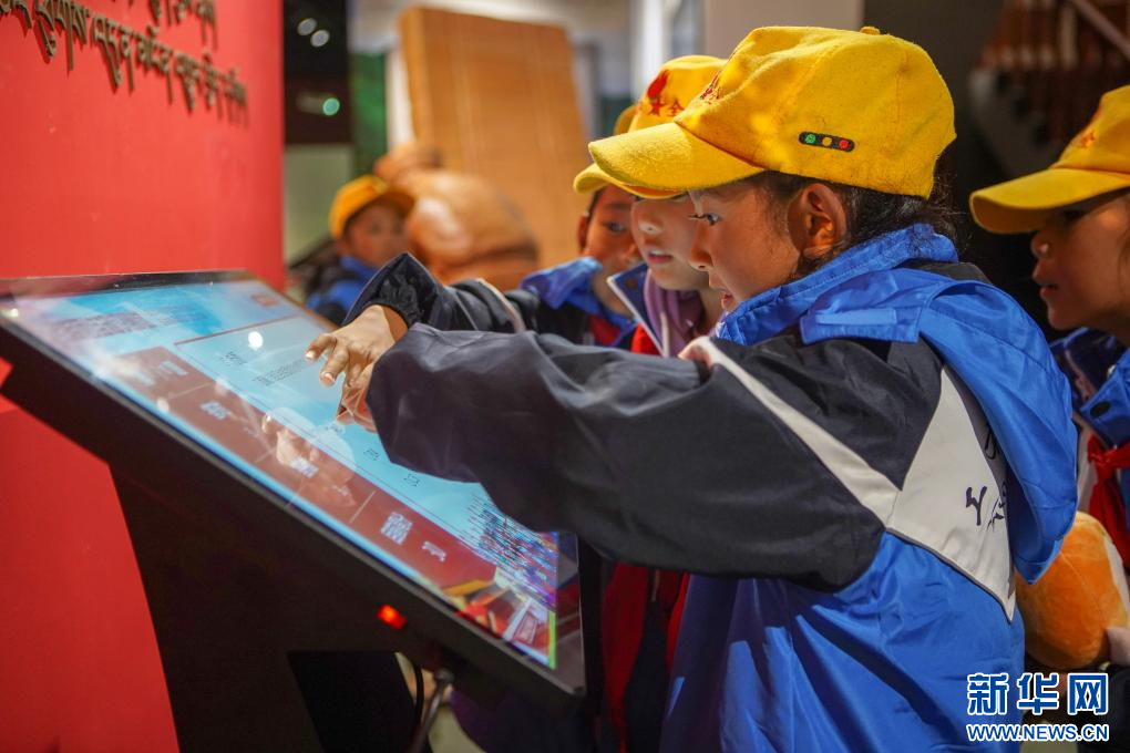 開館儀式當天,當?shù)匦W學生圍在館內(nèi)民族團結(jié)知識測試機器前答題。(9月27日攝)新華社記者 黃智琪 攝