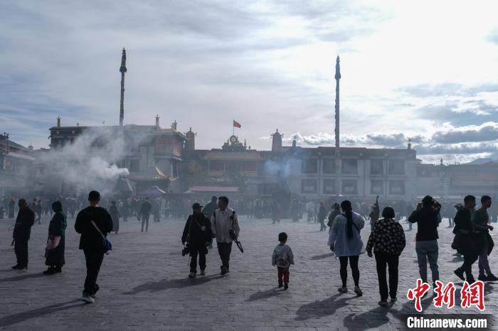 圖為9月30日上午,游客、市民在大昭寺廣場。當日恰逢轉(zhuǎn)經(jīng)日,大昭寺、八廓街桑煙氤氳,熱鬧非常。江飛波 攝