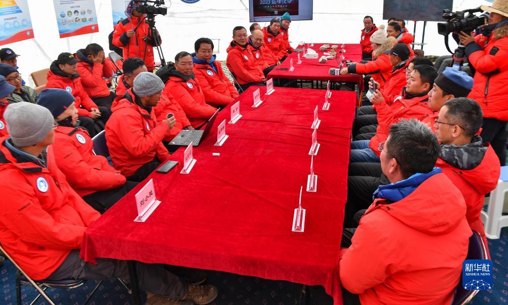 在海拔4950米的卓奧友峰科考大本營,科考隊員趙華標(biāo)(手拿麥克風(fēng)者看電腦者)宣讀剛剛接收到的頂峰氣象觀測數(shù)據(jù),標(biāo)志著峰頂自動氣象站架設(shè)成功,成功傳回觀測數(shù)據(jù)(10月1日攝)。