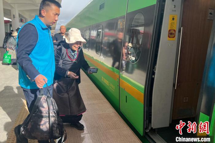 圖為西藏日喀則站工作人員攙扶老人乘車(chē)高原復(fù)興號(hào)。日喀則站 供圖