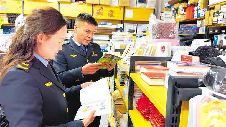 圖為山南市瓊結(jié)縣市場監(jiān)督管理局執(zhí)法人員在某書店檢查。記者 白瑪澤旺 通訊員 倫珠澤仁 攝