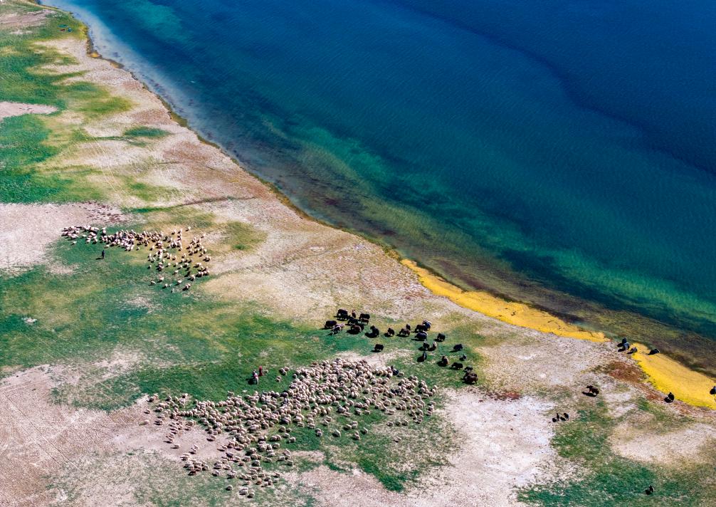 牧民在阿里地區(qū)日土縣班公湖畔放牧白絨山羊和牦牛(無人機照片,9月21日攝)。新華社記者 姜帆 攝