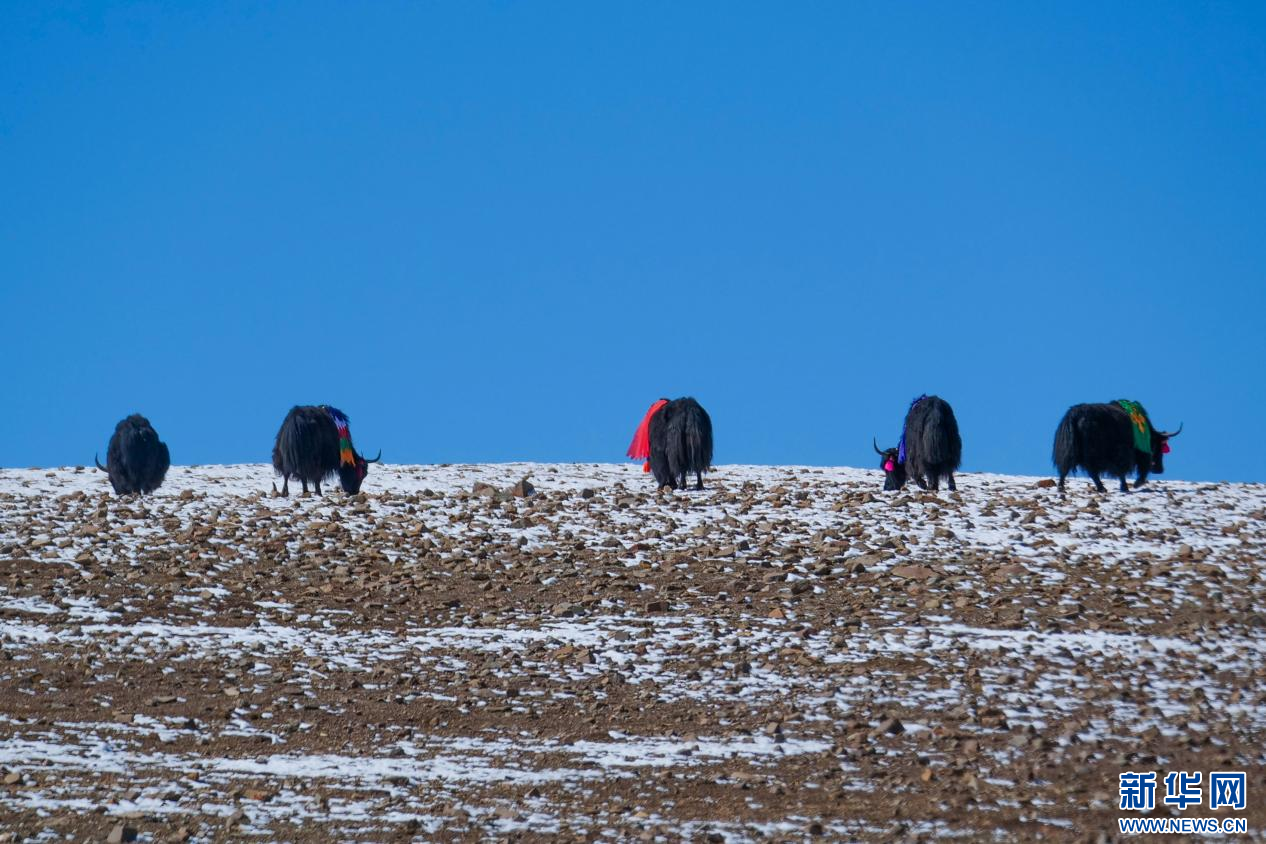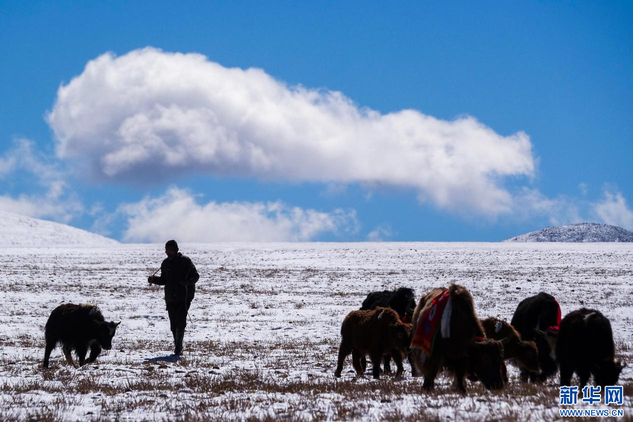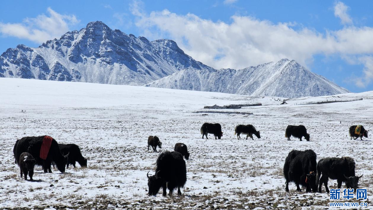 10月13日,在山南市措美縣境內雪山腳下拍攝的牦牛。新華網(wǎng) 柑丹鴦琦 攝